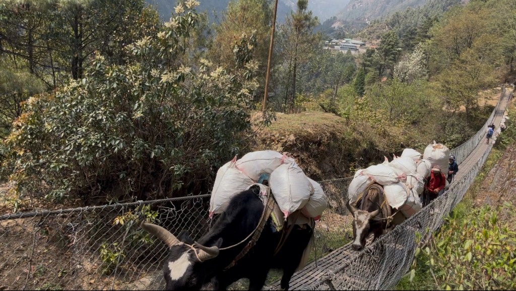 Trek from Phakding to Monjo is adorned with beautiful uphill streams, waterfalls, suspension bridges, and green terraced landscapes. Most of the day we walked along Dudh Koshi river and encountered load bearing mules and Jyopkas (a cross between a yak and a cow) for company.