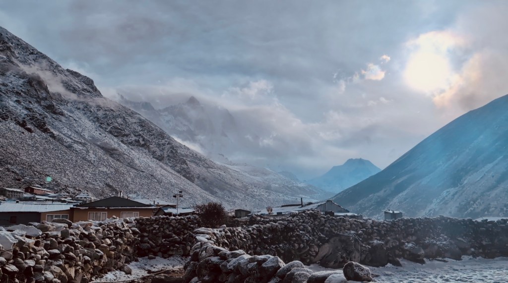 We climbed up Nangkartshang peak on a cloudy day and were literally walking in the clouds. The mountains (Thamserku, AmaDablam, Island peak) played peekaboo with us as the clouds moved in and out to cloak them before revealing them for a few interval seconds.